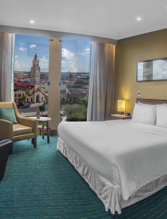 DoubleTree by Hilton Iquitos offers a refined stay in the heart of the Peruvian Amazon. Relax in the elegant King Room Deluxe Suite, enjoy the rooftop pool with panoramic city views, and stay active in the fitness center. With signature dining and easy access to the Amazon River and Belén Market, your adventure begins here.